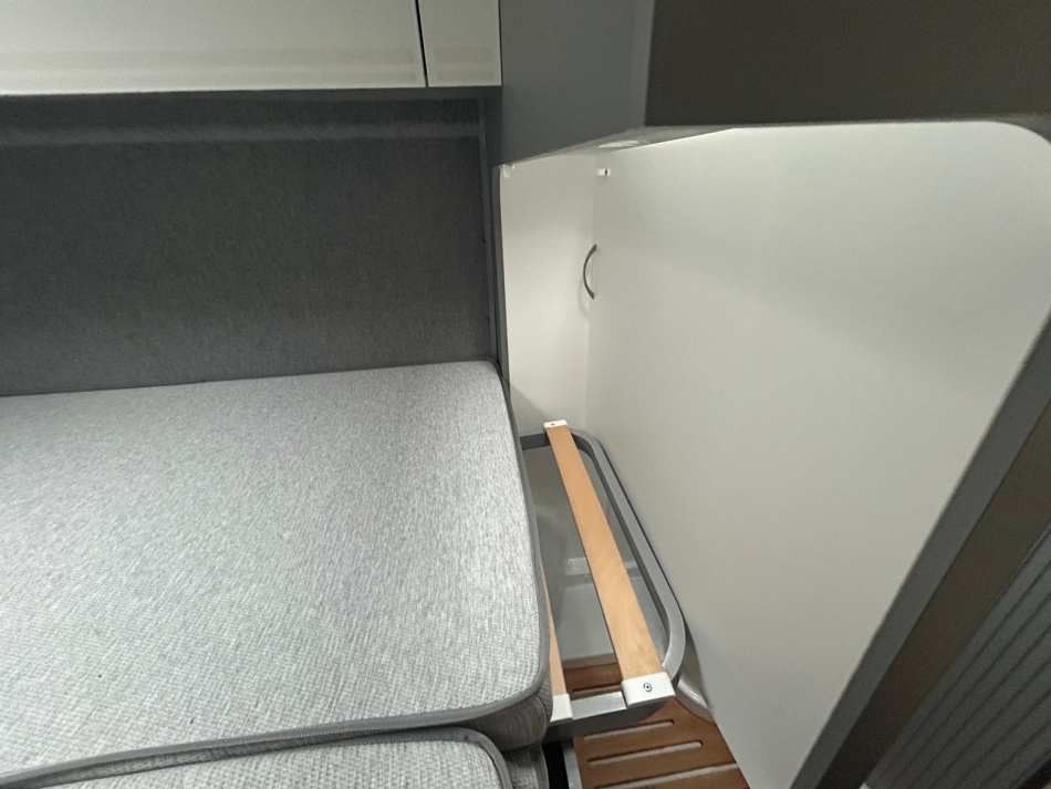 DECOR "MOTION" (SOL DECOR PARQUET EN BOIS, TIROIRS ET MURS GRIS CLAIR, PLACARDS HAUTS BLANCS, :