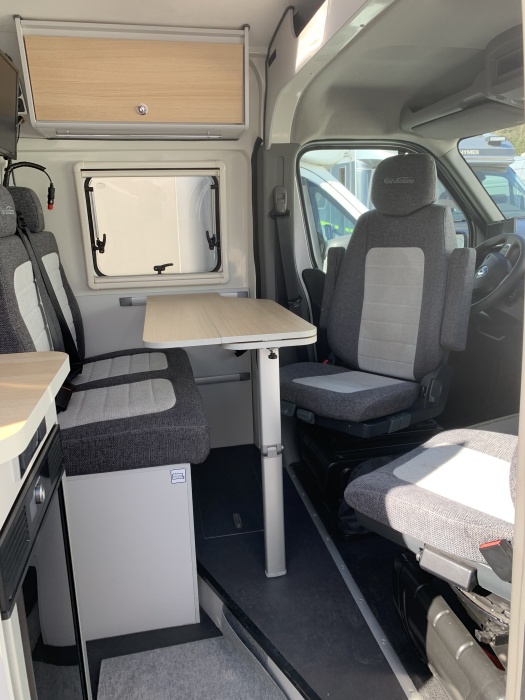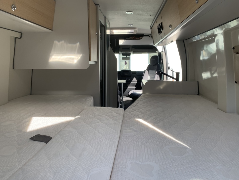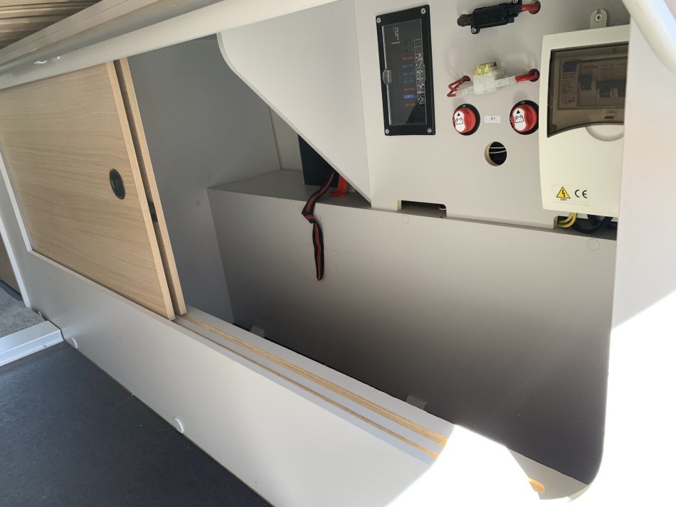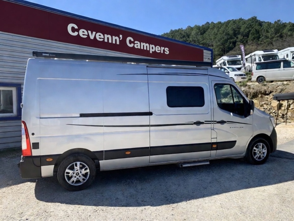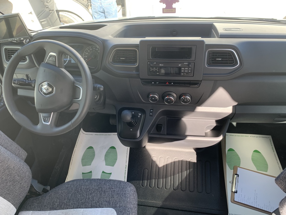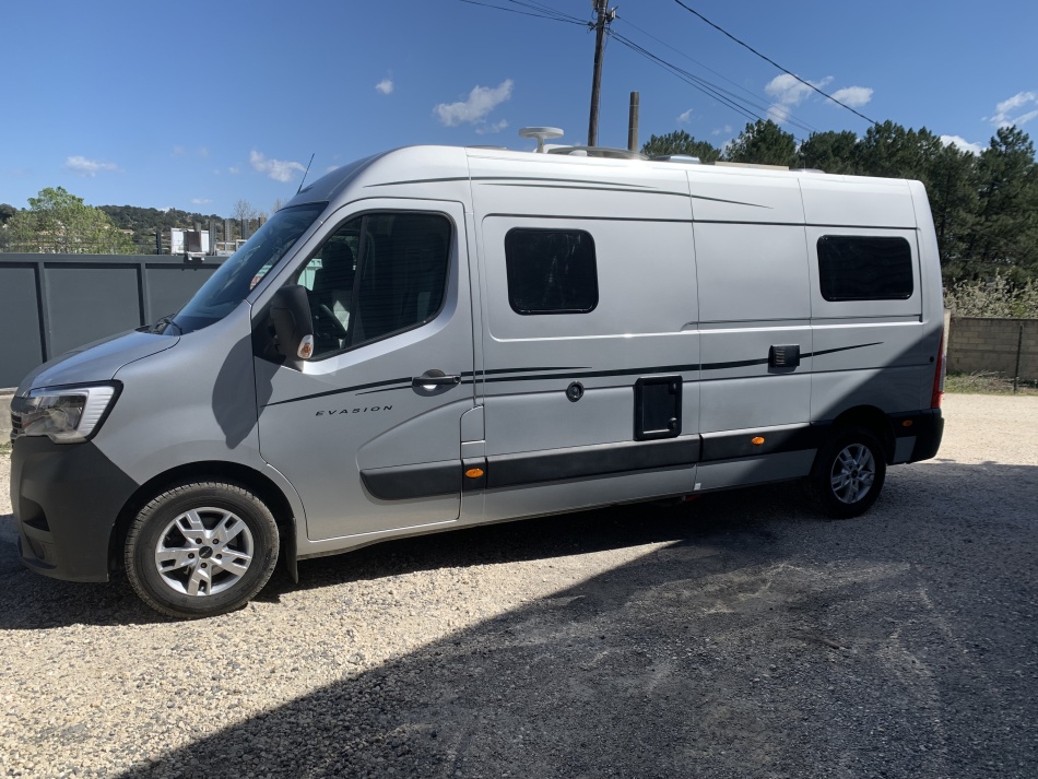 Options porteur (Renault Master) Centralisation des portes Vitres et rétroviseurs électriques Climatisation cabine Boîte robotisée 6 rapports Régulateur et limiteur de vitesse Start & Stop Allumage automatique des phares et essuie-glaces Banquette arrière Isofix Jantes aluminium Peinture gris aluminium métallisée Caméra de recul Autoradio USB / Bluetooth avec commandes au volant Roue de secours Attelage Suspension pneumatique Équipements cellule Store extérieur Baies affleurantes Marchepied électrique Moustiquaire de porte Panneau solaire Batterie lithium 100 Ah Antenne satellite automatique Antenne terrestre TV + lecteur DVD Chauffage & chauffe-eau Truma D4 gasoil Réfrigérateur à compression 70 L